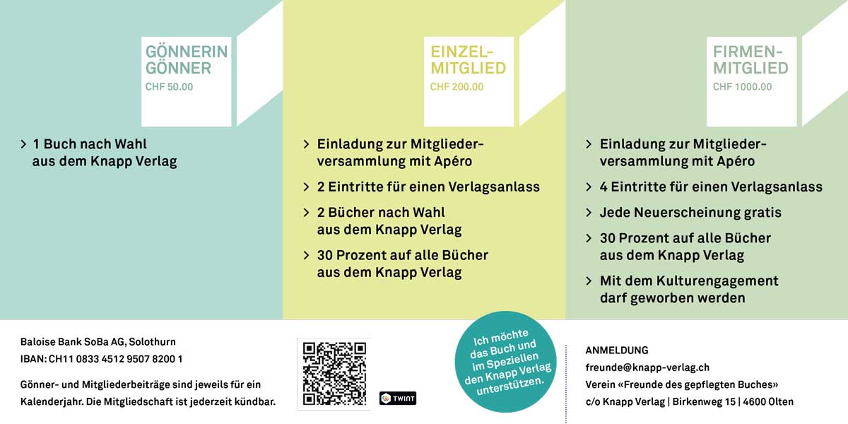 Engagierte Persönlichkeiten aus Kultur und Wirtschaft haben 2016 den Verein «Freundinnen und Freunde des gepflegten Buches»* ins Leben gerufen. Mit diesem Engagement soll das Buch, die Literatur und der Knapp Verlag finanziell gefördert werden. Der Förderverein verfügt über Statuten und handelt eigenständig.